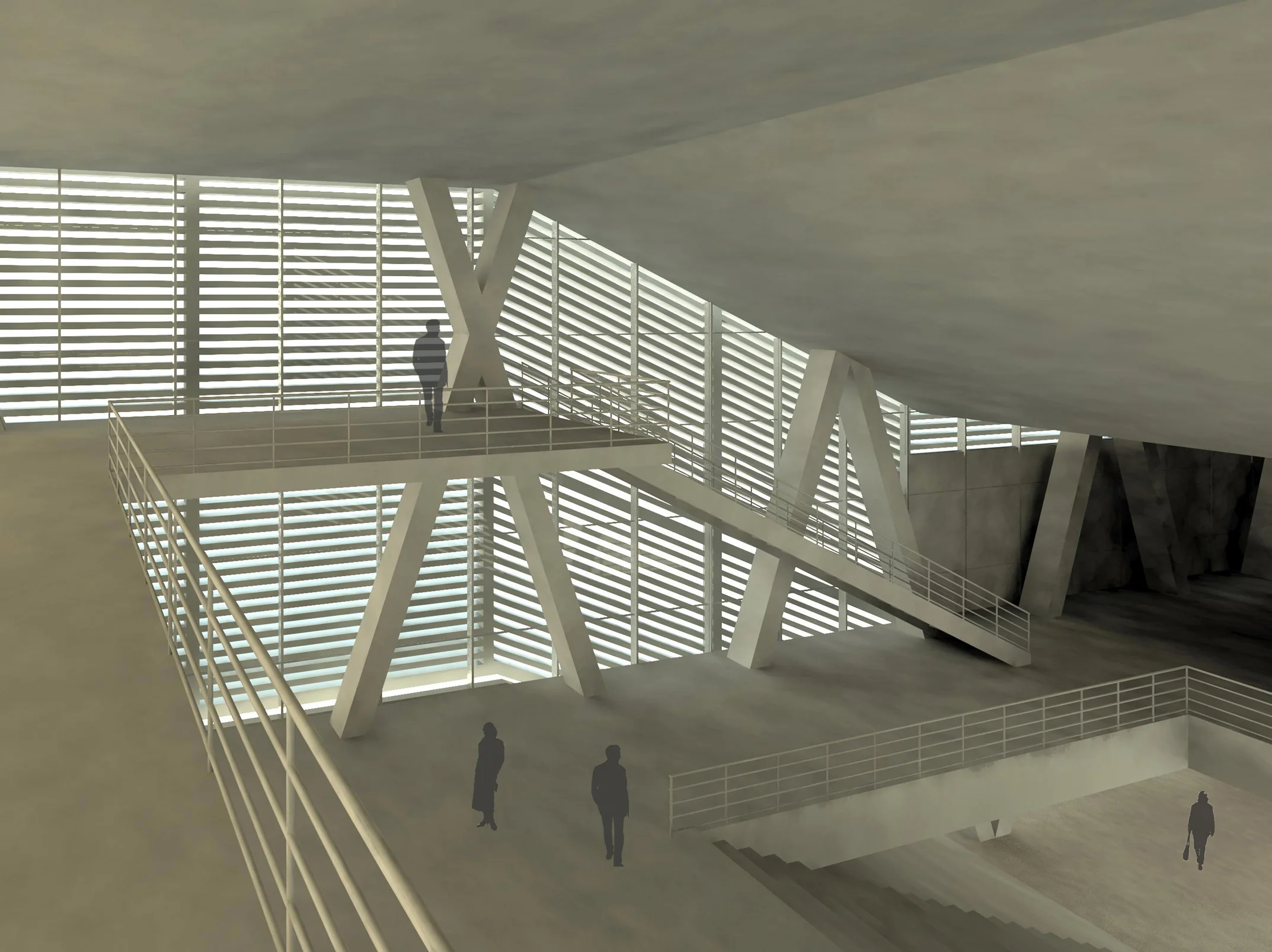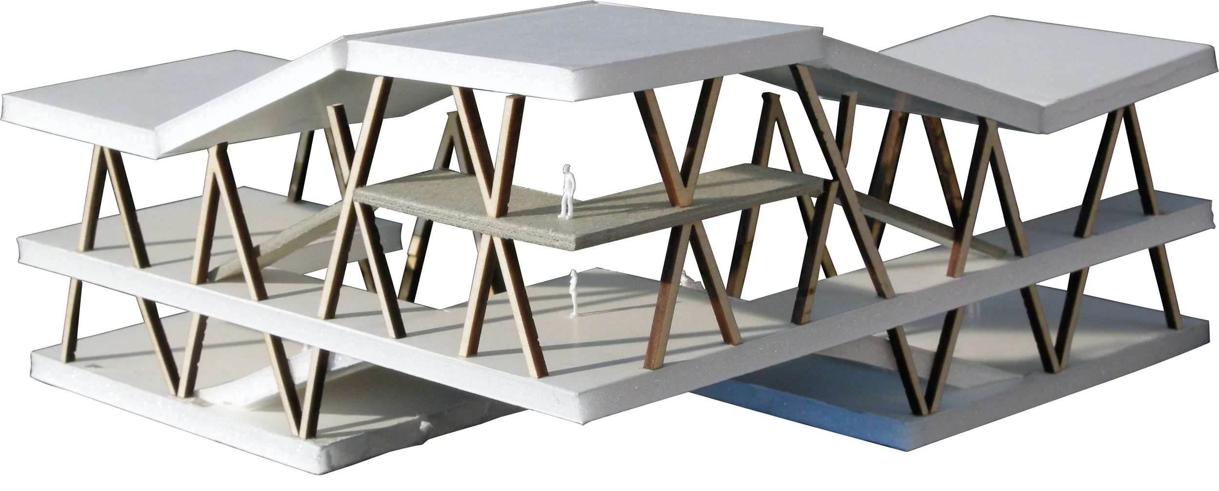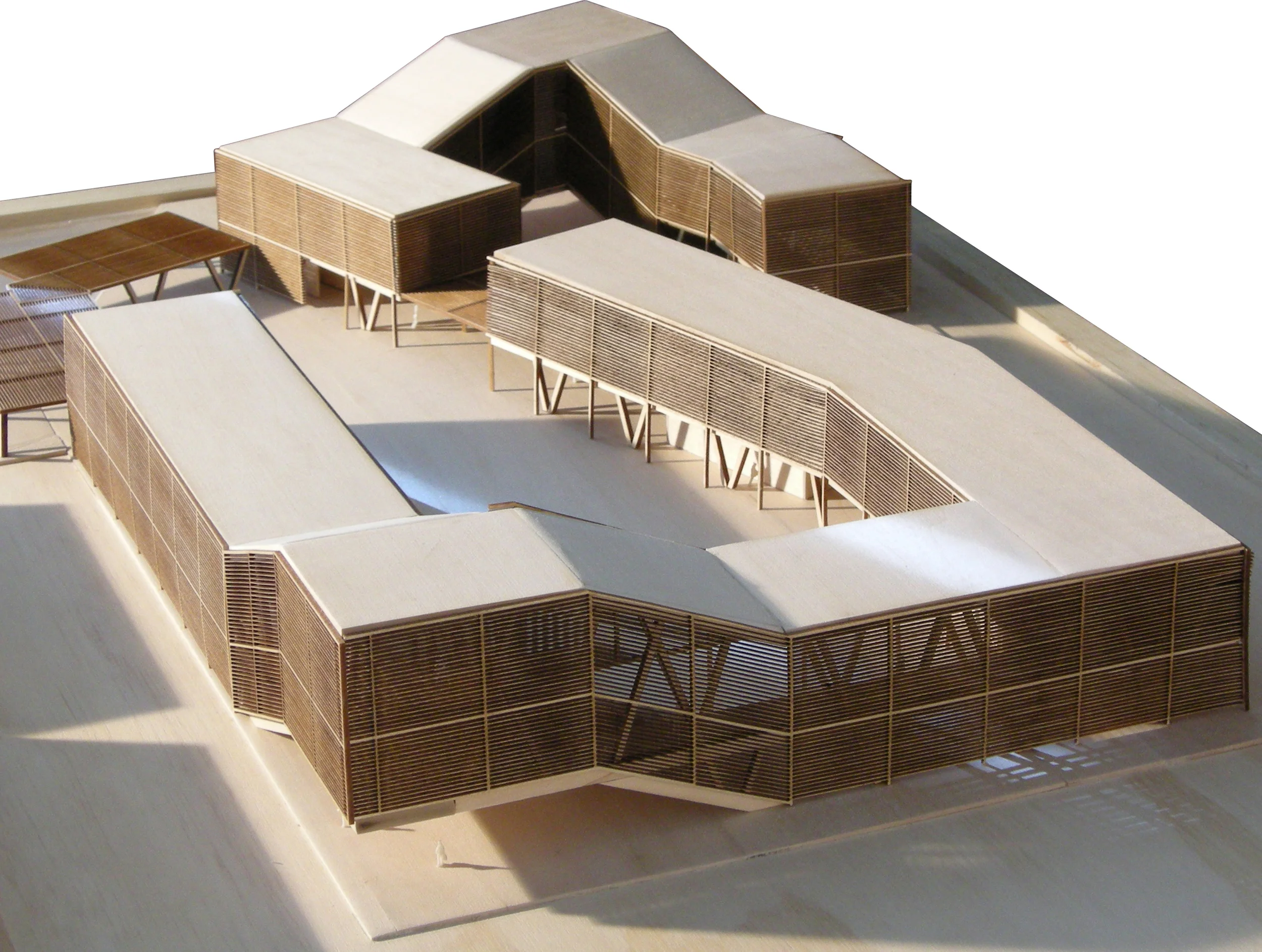 A museum and community center for the proposed city of Ruwais, United Arab Emirates. Located at the northern end of a boardwalk which runs along the eastern shore of the city’s planned harbor, the museum creates an anchor for the boardwalk and engages it with an adjacent residential neighborhood. The building’s form is based on the courtyard typology common to the Middle East with an enclosed structure split in two, creating a courtyard with free circulation between the museum interior, exterior, and boardwalk. Opposite corners of the two forms are raised to create additional connections between the courtyard and surrounding site. Both the museum and courtyard are covered by a shading system which limits direct sunlight, but creates an airy, open, light-filled environment.
