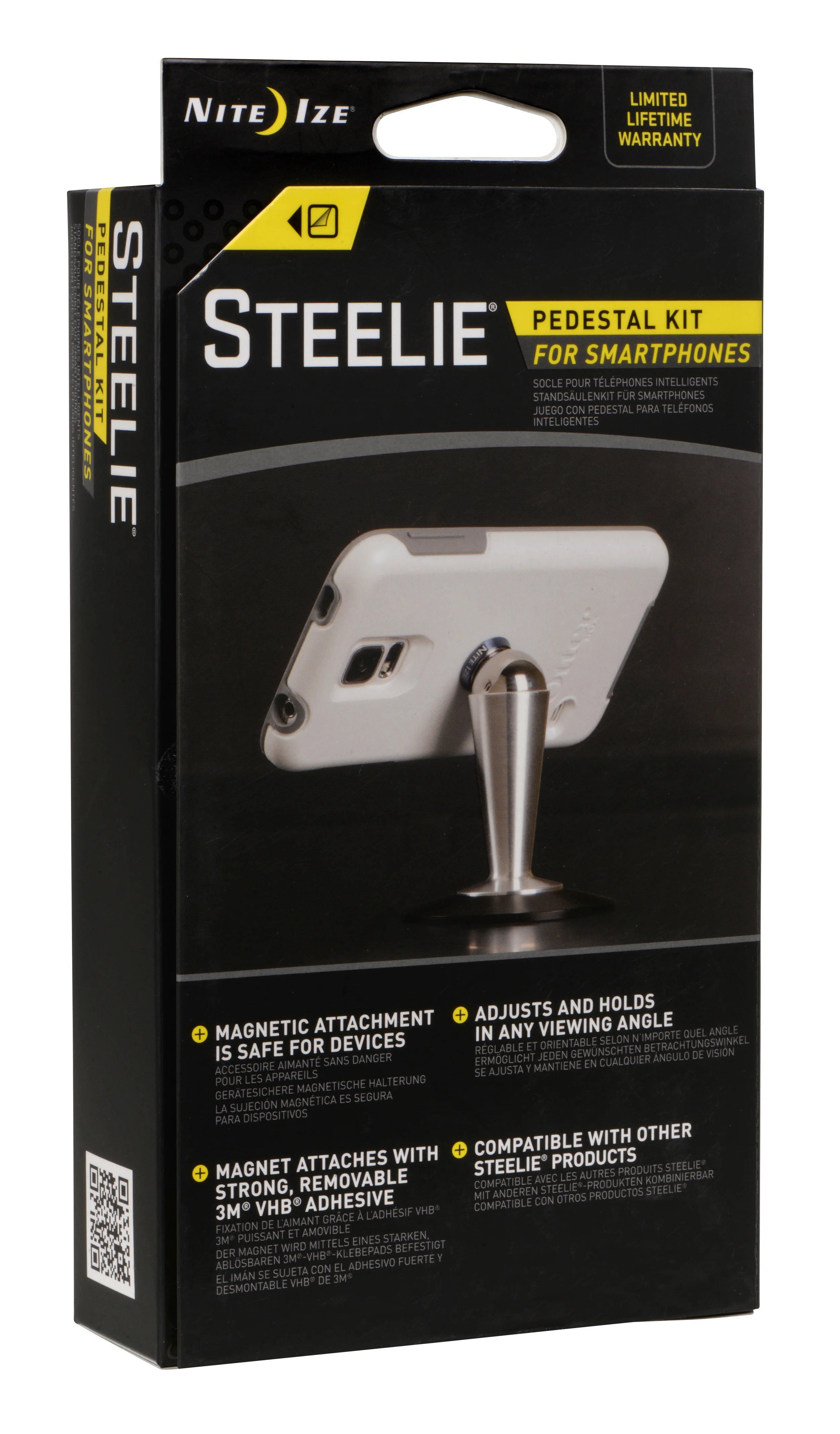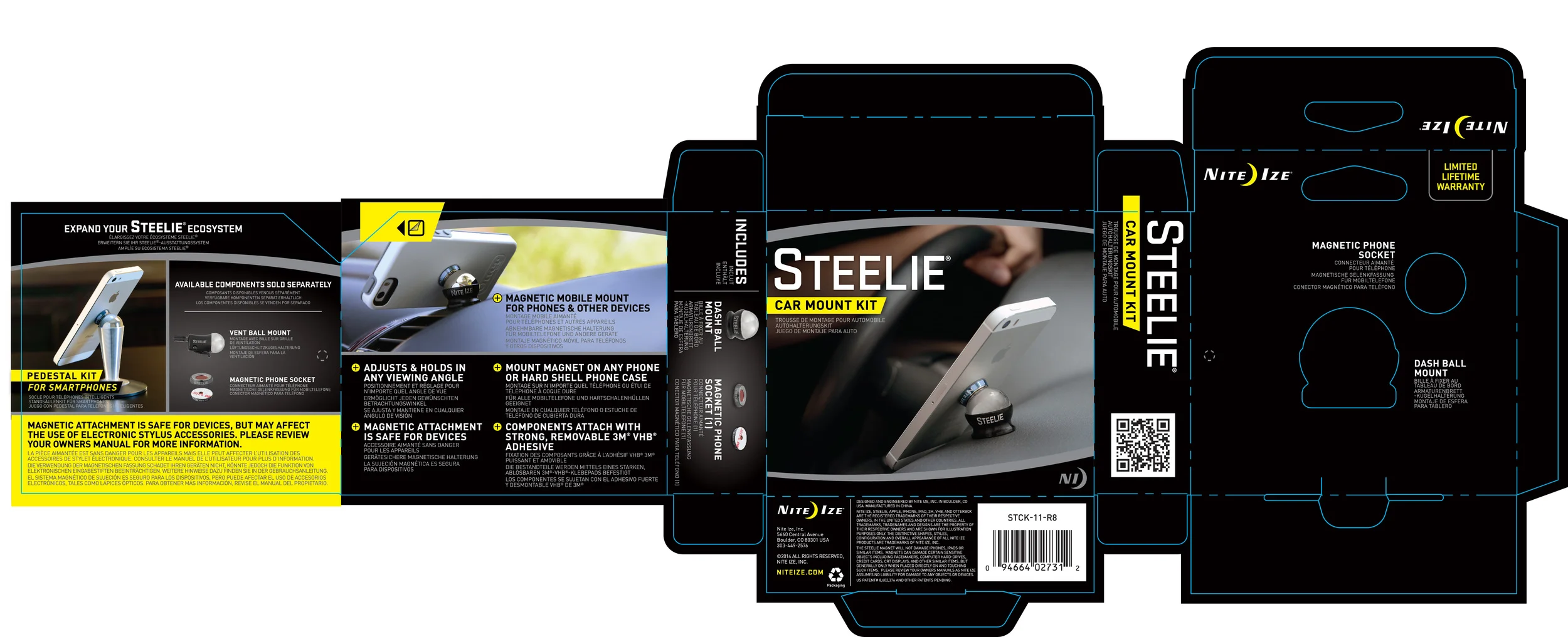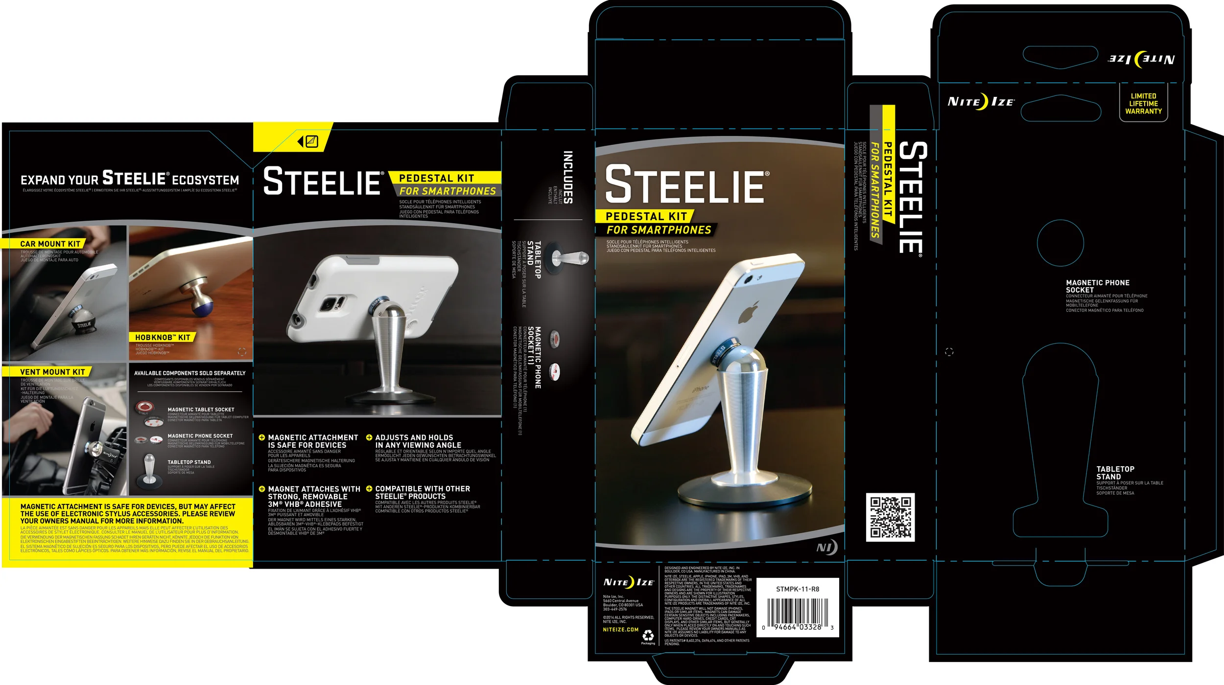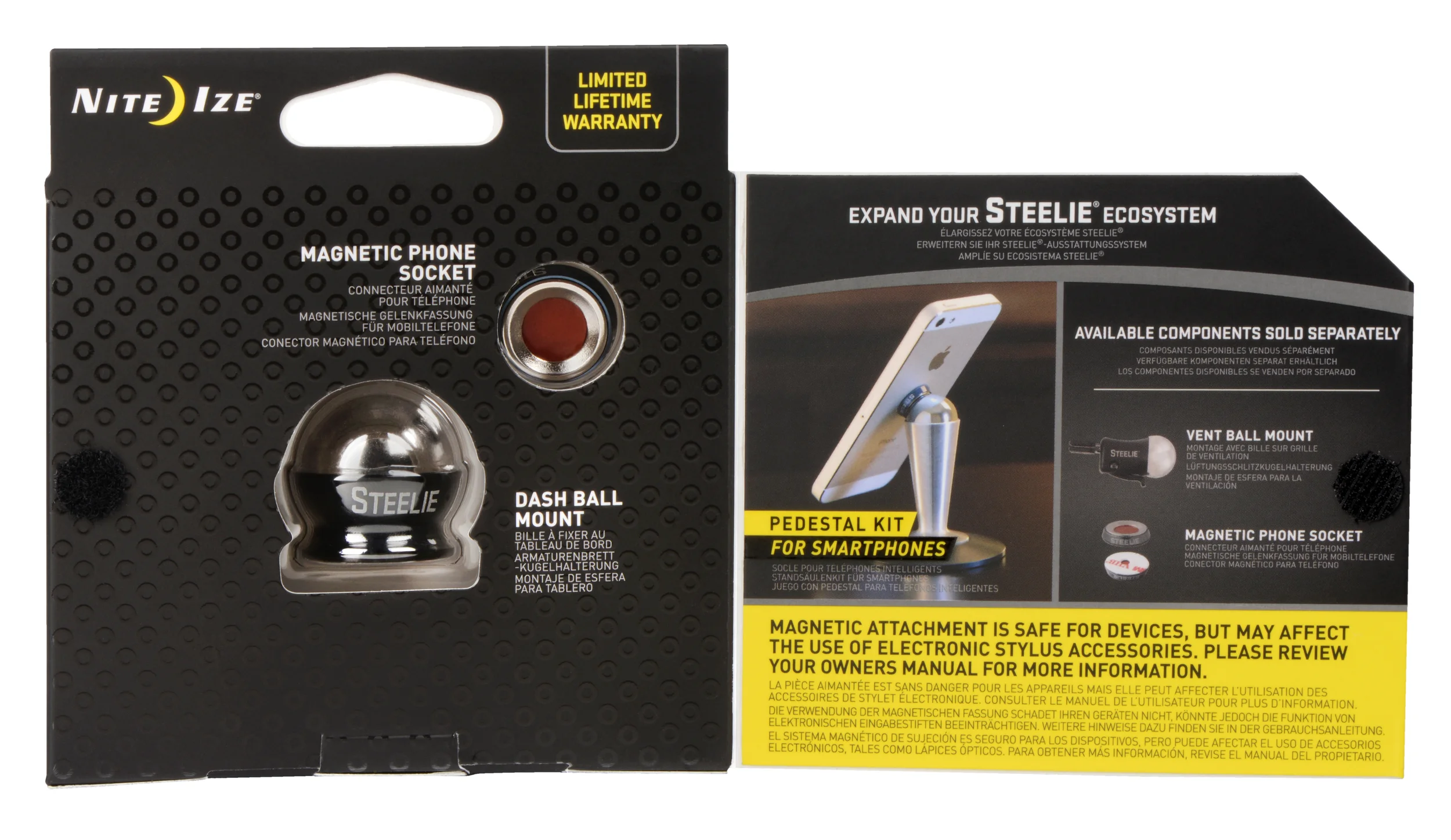 Packaging structure and graphic design for a line of magnetic smartphone mounts. Boxes with folding panels showcase the design of the products while conveying necessary information and perception of quality.